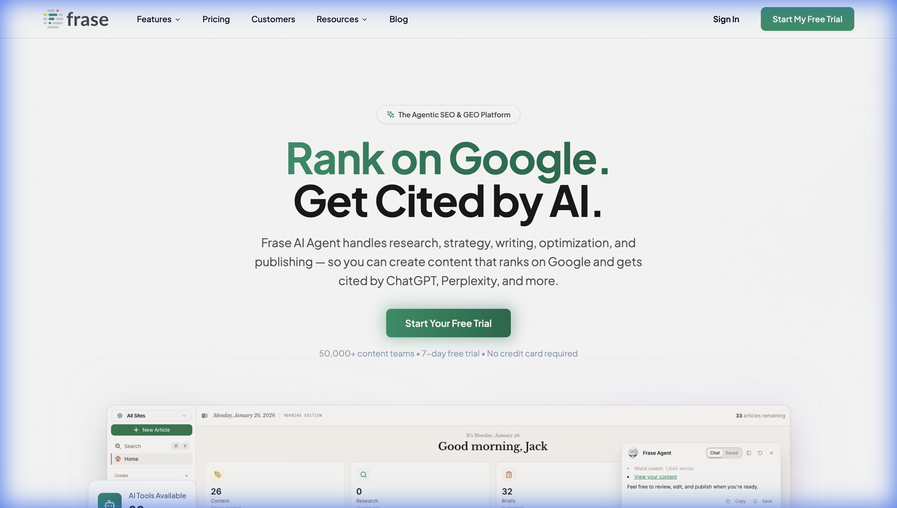 Frase combines SERP research (analyzing what's currently ranking), an AI writing assistant, and content optimization scoring. They've also moved into GEO (Generative Engine Optimization) territory, with features designed to help content get cited by AI platforms specifically.