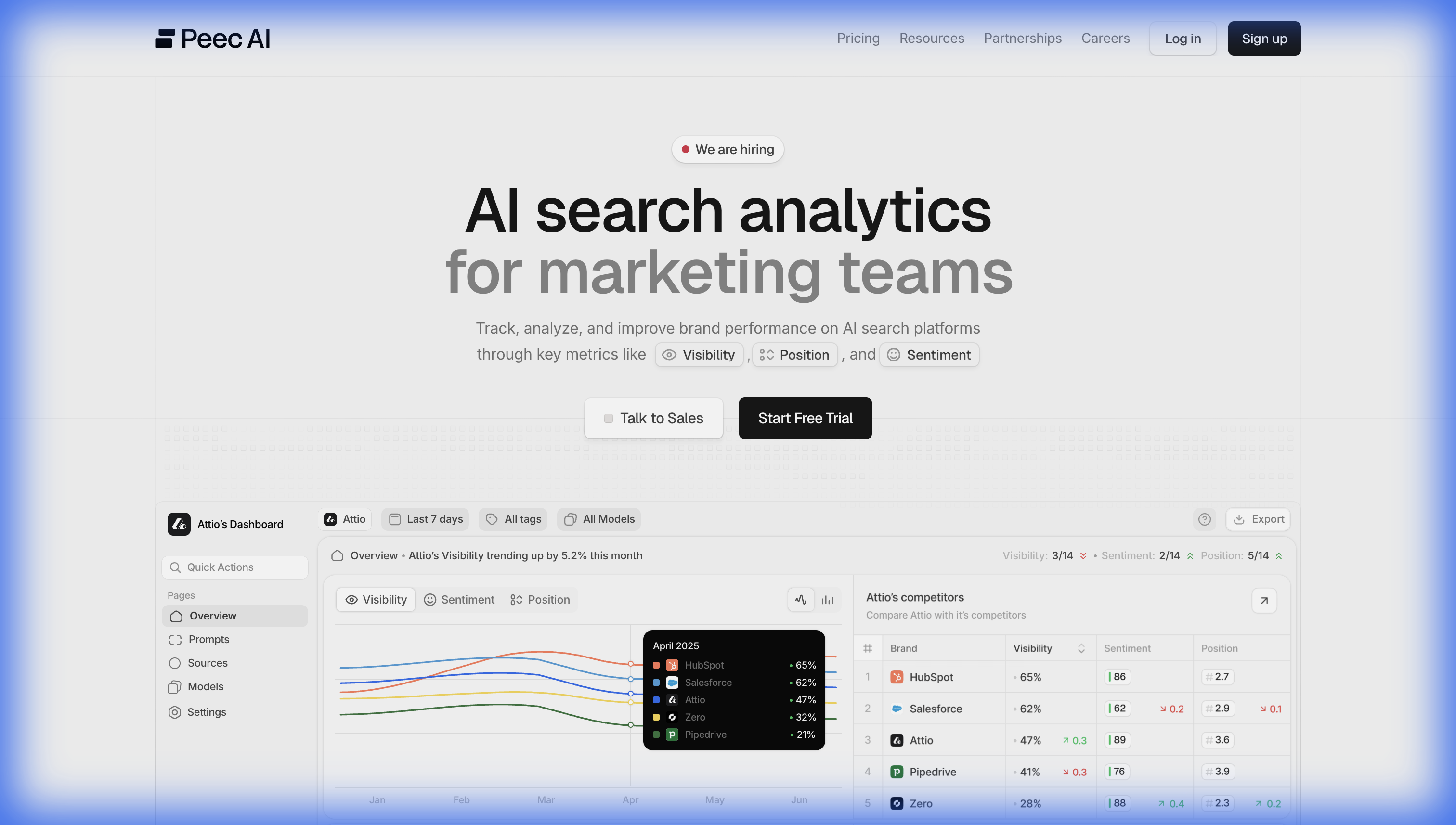 | Peec.ai | Visibility | Contact | Brand sentiment, competitive benchmarking |